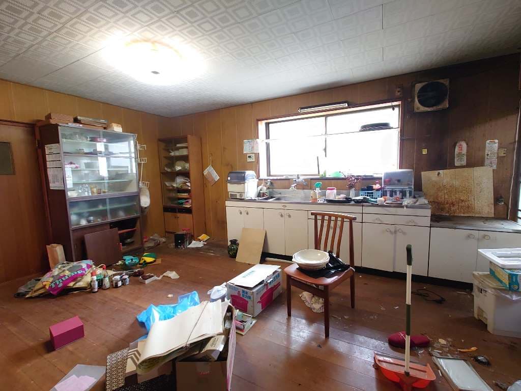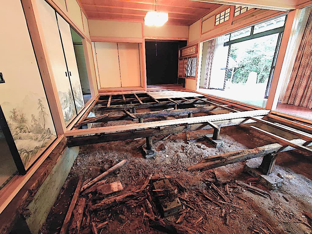 残置物が多く雨漏りがあり、シロアリで床が無くなっておりましたが、その状態のまま弊社でお引き取りいたしました。
