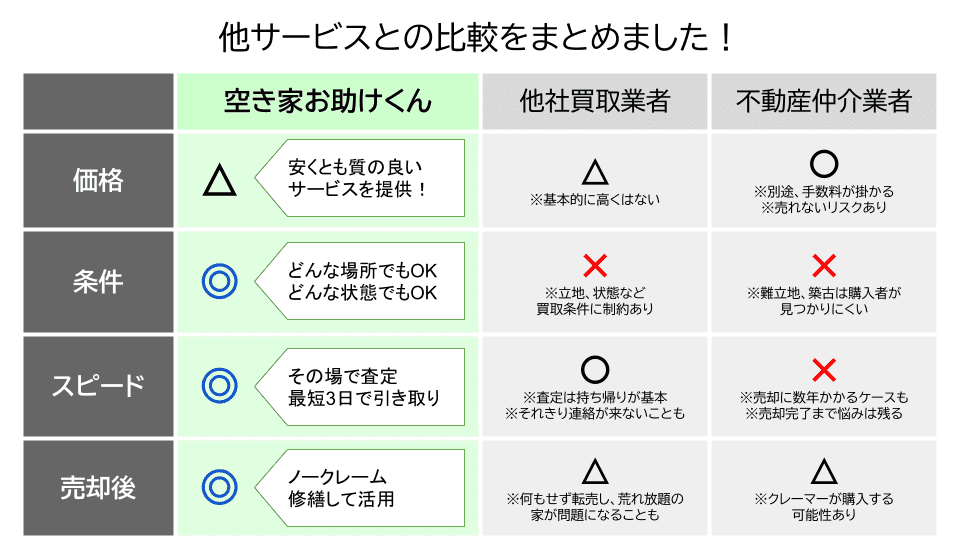 その点、空き家お助けくんは、価格で劣る分、どんな家でも、すぐに引き取ることで、活動の手間や維持費を含むトータルコストを抑えることができます。また、売却後の安心を保証し、お客様にとって喜ばれるサービスを展開しております。
